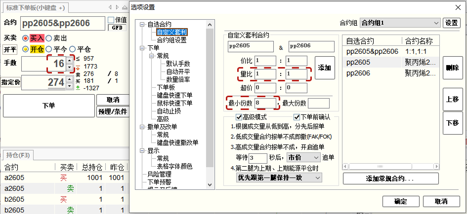 - 则单腿手数最终下单手数为:pp2605 = 16 手,pp2606 = 16 手 我们需要配置最小份数,让每次触发时下单的手数都满足条件,比如设置最小份数为8,则:
