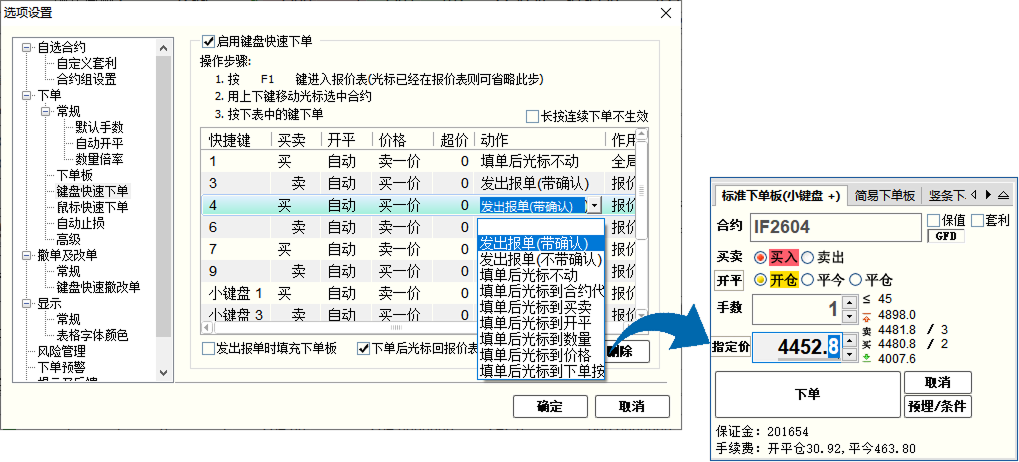 并且快期2中键盘手工下单非常高效,支持设置键盘上任意键作为炒单快捷键,并且对选择的按键设置不同的动作:可直接发出报单,也可以快速填单后在下单板按enter键下单。