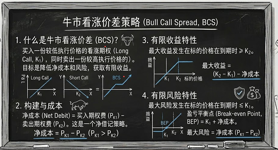 牛市看涨期权价差,是一个很典型的“有限风险、有限收益”看涨策略。做法并不复杂,就是买入较低行权价的 Call,同时卖出较高行权价的 Call,两条腿标的相同、到期日相同。它适合“看涨,但没看到特别夸张”的行情判断。真正理解这个策略的重点,不是背公式,而是看清它为什么能把成本压下来,又为什么会把上涨收益封顶。