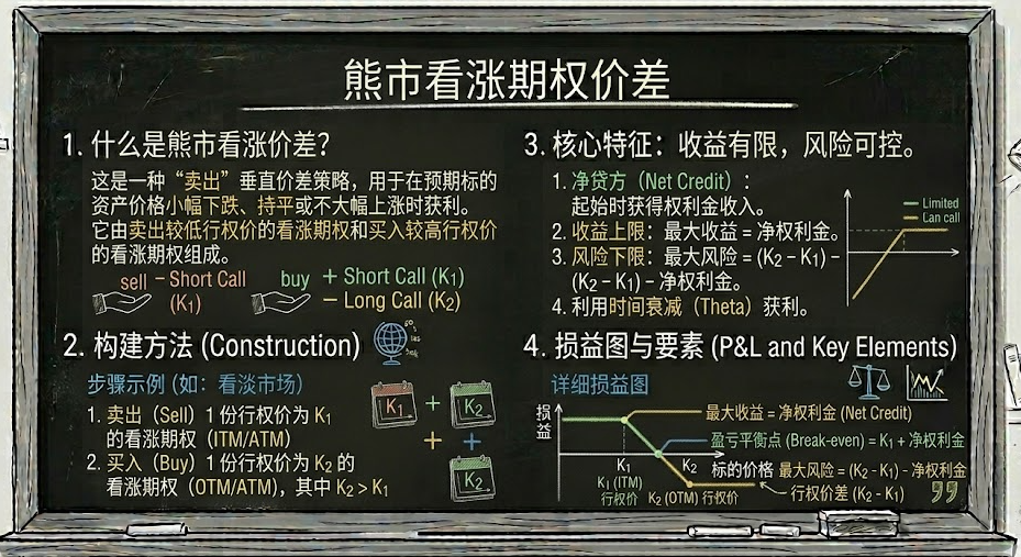 熊市看涨期权价差适合一种很常见的判断:不看涨,或者偏空,但没必要押特别深的下跌。它通过“卖出低行权价 Call、买入高行权价 Call”的方式,先收一笔权利金,同时把极端上行的风险封住。