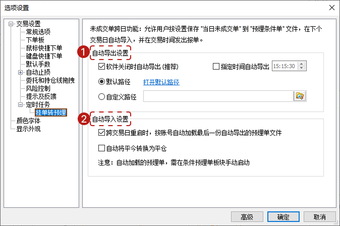 并且增加了一个非常贴近实际场景的衔接:下一交易日启动软件时,支持自动导入“最后一次自动导出的挂单转预埋列表”。你可以把它理解成:把原来靠记忆的日终动作,变成可配置、可追溯的工作流。