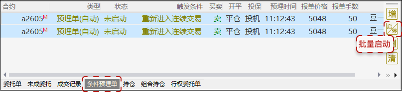 - 全选预埋单列表,一键启动,等待开盘触发。