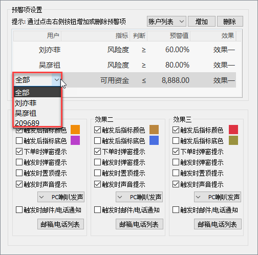软件提供了丰富的预警效果,包括变色、弹窗、声音等